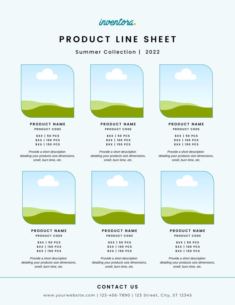 - Create and design your linesheet. View our example below to help make this as easy as possible for you