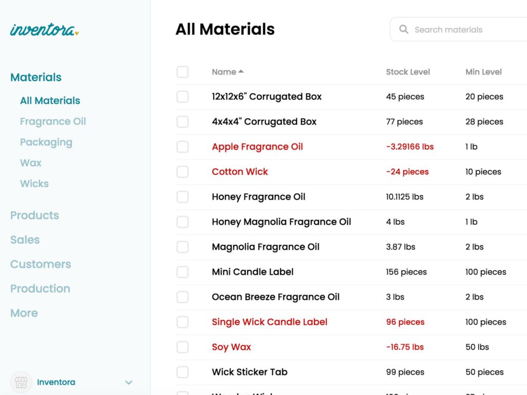With an inventory system like Inventora, you are able to review your all the data needing to be collected. In addition to obvious numbers, you are able to check things like total sales reports, performance during specific dates, your products and materials inventory value, and determine your best and worst selling products.