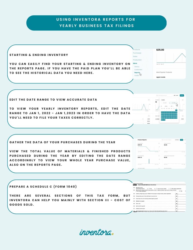 Continue to be aware of how any government relief can impact your taxes while keeping track of important dates throughout the year. If you supply yourself with the resources available to your business through using Inventora reports for yearly business tax filings, you will complete tax season with ease.